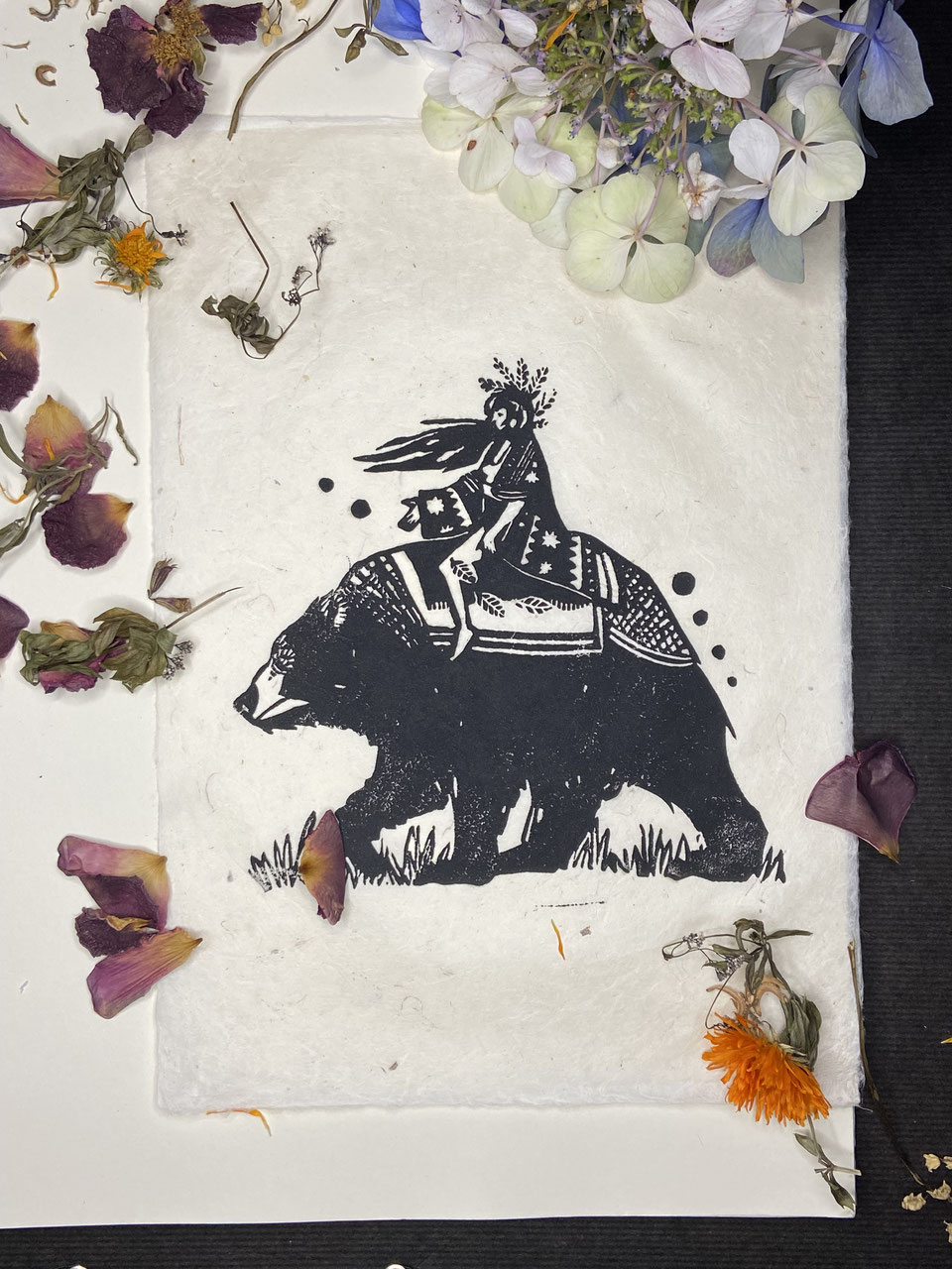 Linoldruck auf handgeschöpftem Seidelbastpapier aus Nepal